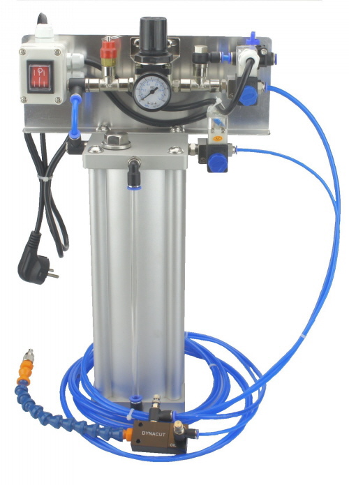 Bei unserem DYNACUT Schmiersystem MDA handelt es sich um ein von uns entwickeltes Niederdrucksystem mit koaxialer Sprühdüse für nebelfreien Kühlmittelauftrag. Bei diesem System steht der Kühlmittelbehälter über ein Druckregelventil unter einem Druck zwischen 0,3 bis 1,5 Bar je nach Viskosität des Kühlmittels. Dadurch wird erreicht, dass nach dem Einschalten der Druckluftversorgung der Schmierstoff und die Blasluft mit unterschiedlichen Drücken getrennt voneinander bis zum Düsenaustritt geleitet werden und dort feinste Kühlmitteltröpfchen in den Luftstrom an der Düsenspitze gedrückt werden. Das Volumen des Luftstroms an der Düsenspitze und damit auch der Druck werden durch ein einstellbares Nadelventil an der Düseneinheit eingestellt. Die Zufuhr des Kühlmediums wird ebenfalls mit einem Nadelventil an der Düseneinheit eingestellt. Bei richtiger Einstellung arbeitet das System absolut nebelfrei.